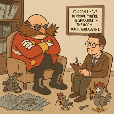 Dr. Robotnik is a genius whose ego has outgrown his humanity. His war isn’t really against Sonic—it’s against his own fear of irrelevance. Underneath the armor, goggles, and mustache… is a very tired boy who once wanted to build something beautiful. But then he got called “Eggman.”